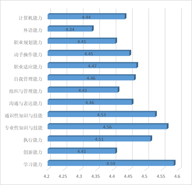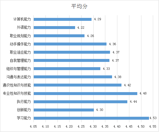 根据参与调查问卷的用人单位反馈情况,对毕业生个人能力等认可度比较高。如图所示,5分为满分,分数越高其满意度越高。
