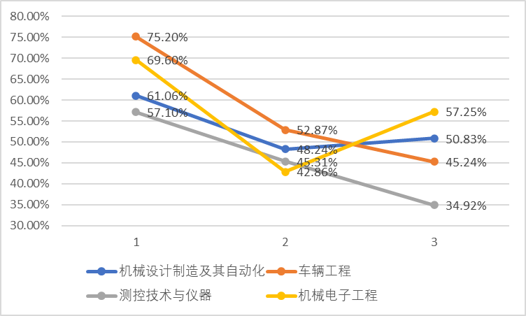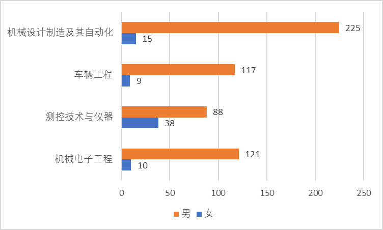 爱游戏ayx体育2021届本科毕业生共4个专业,分别是机械设计制造及其自动化、车辆工程、测控技术与仪器、机械电子工程。其中机械设计制造及其自动化专业240,车辆工程专业126人,测控技术与仪器专业126人,机械电子工程专业131人。分学历层级专业分布图如图4所示。