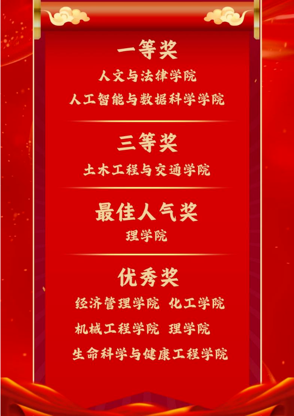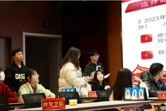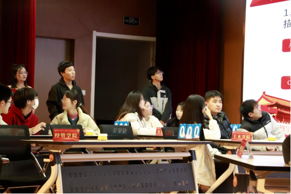 决赛环节,来自人文与法律学院、人工智能与数据科学学院、土木工程与交通学院、经济管理学院、生命科学与健康工程学院、理学院、化工学院、爱游戏ayx体育的8组选手,通过必答题、抢答题、风险题、一题决胜等环节进行激烈角逐,现场300余名观众积极参与,气氛热烈。