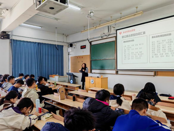 安老师首先以三张OH卡进行引入主题,和同学们进行提问互动,通过情景模拟强调区分客观事实与主观评价的重要性;随后结合案例,引导听众学习精准表达情绪词汇、合理提出需求的方法,并深入剖析“全身心倾听”对化解矛盾的关键作用。互动环节中,学生通过角色扮演体验非暴力沟通技巧,现场反响热烈。