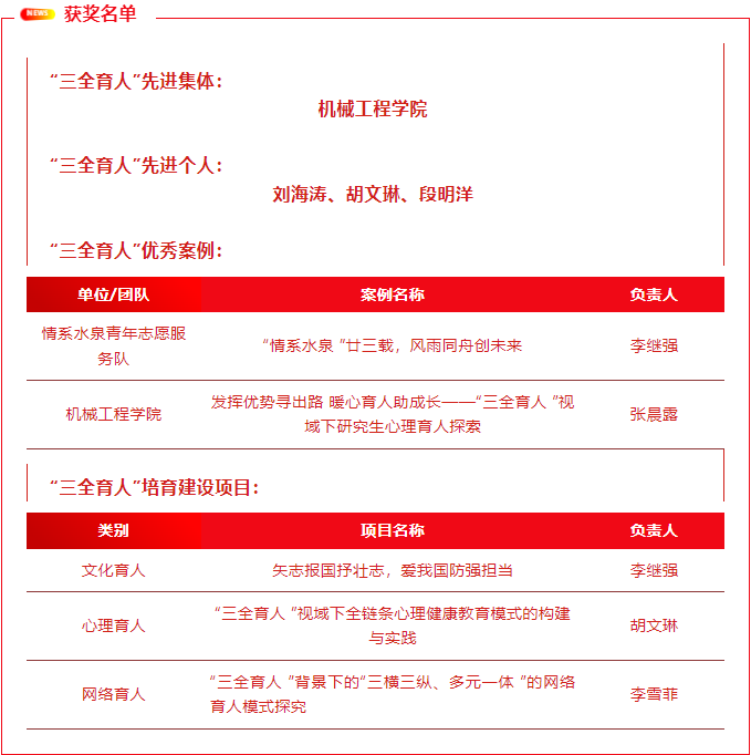 为全面贯彻立德树人根本任务,切实提升新形势下高校思想政治工作质量,调动广大教职员工全员全过程全方位育人的积极性,学校开展“三全育人”先进集体、先进个人、优秀案例和培育建设项目评选活动,kaiyun体育网页登录入口积极组织学院教师申报,经学校评审获奖名单如下: