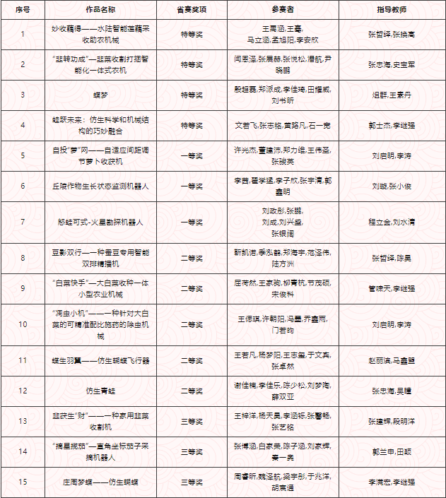 本届赛事以“机械创新推进农业现代化、自然和谐迈向仿生新高度”为主题,爱游戏ayx体育于2023年4月份面向全校发布预通知,经过校赛初赛和复赛,从25支队伍120名学生中选拔出15支队伍19名学生参加省赛。