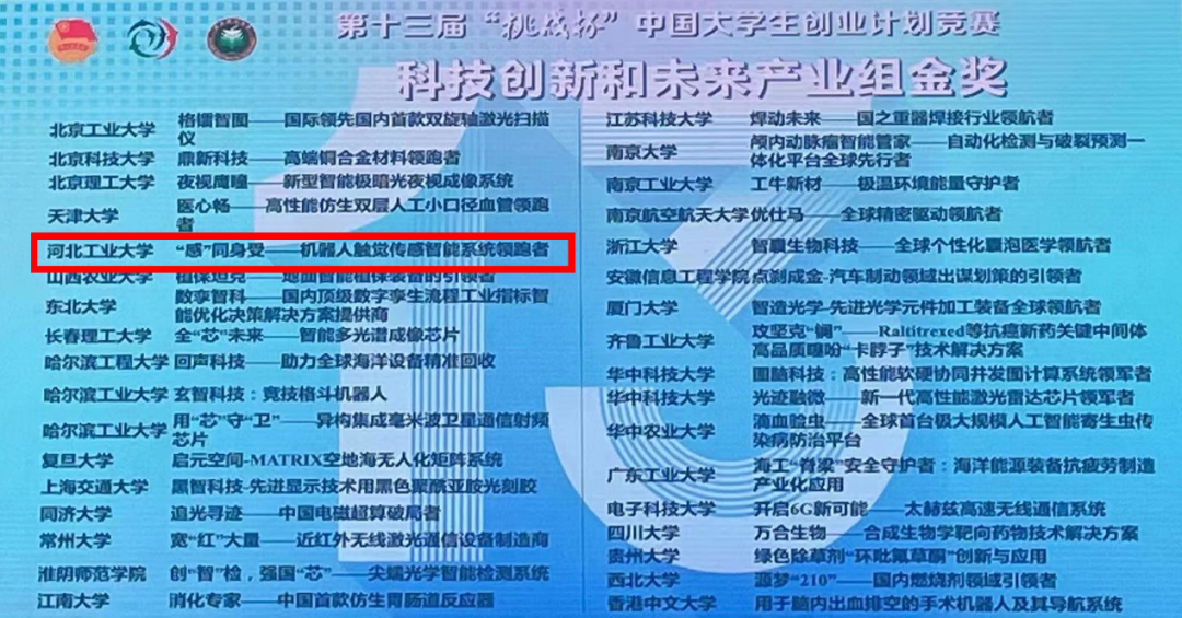 3月19日,第十三届“挑战杯”中国大学生创业计划竞赛全国决赛在北京理工大学落下帷幕。我院郭士杰团队指导的“感”同身受——机器人触觉传感智能系统领跑者项目团队历经校赛、省赛,又经国赛网评、复评、现场答辩等多轮评审环节,最终斩获国赛金奖。