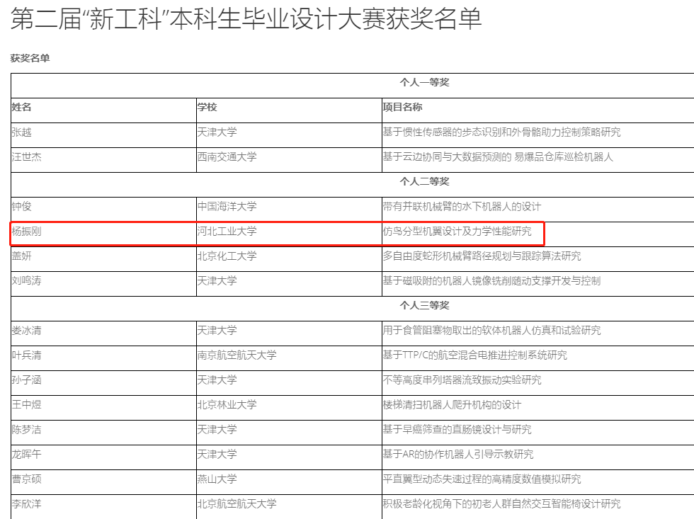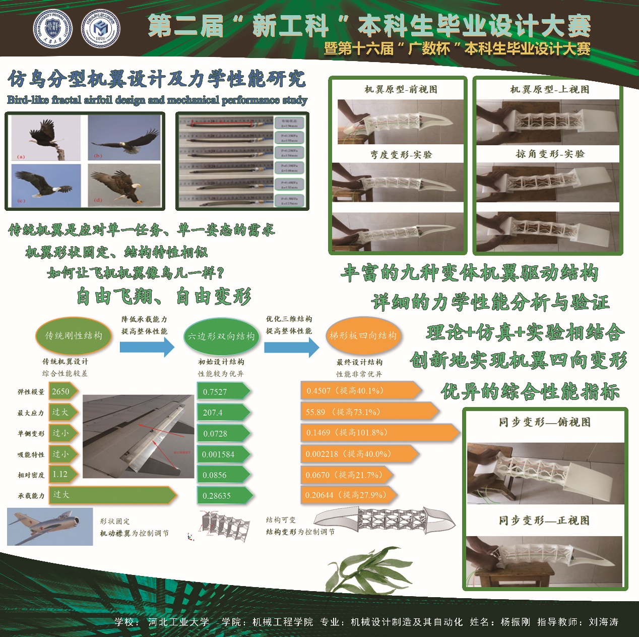 以“交叉融合,智创未来”为主题的第二届“新工科”本科生毕业设计大赛决赛于2022年6月15日在天津大学以线上会议的形式召开。经过答辩和评审,我院机械设计制造及其自动化专业学生杨振刚的本科毕业论文《仿鸟分型机翼设计及力学性能研究》荣获个人项目二等奖。