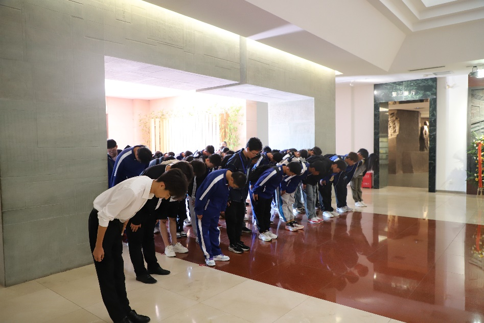 在纪念馆门前,同学们整衣肃立,敬献花篮,并面向李大钊同志塑像三鞠躬,以此表达内心敬仰和怀念之情。随后,同学们高举右拳,庄严宣誓:以青春之我,担时代之责。