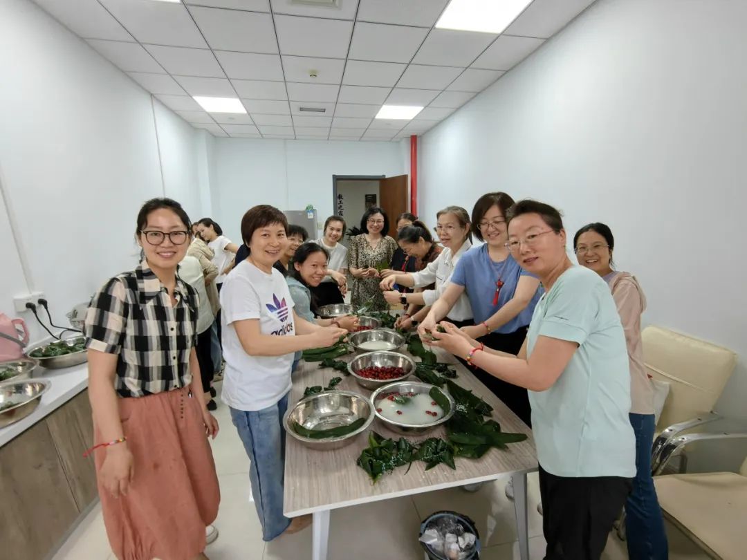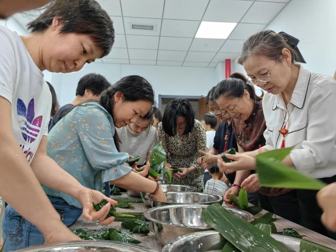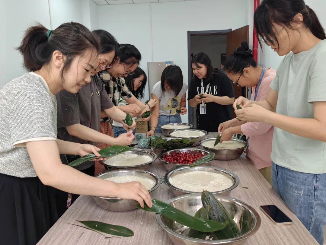 暖意浓浓,老师们佩戴香囊和五彩绳,交流着家乡的端午习俗。包粽子比赛热闹非凡,学院准备了叶、糯米、红枣等材料,老师们做漏斗、填糯米、包裹、捆绑,一片绿叶、一缕清香、一根细绳包裹着华夏传承千年的味道,空气中弥漫着叶香。