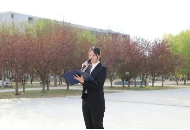 随后,学生代表朱贺蕊同学发言,她以"传承长征精神,勇担时代使命"为主题,回顾九十年前红军二万五千里长征铸就的精神丰碑,指出当下国家迈向2035年基本实现社会主义现代化,正是新时代青年的“新长征”,这场新长征有科技突围的 “封锁线”、高质量发展的 “娄山关”,更需青年挺膺担当。她号召同学们将个人成长融入国家发展,深耕专业、锤炼本领,以“啃硬骨头”的决心攻克科研难题,用实际行动践行“请党放心,强国有我”的青春誓言。